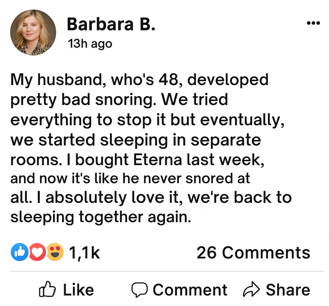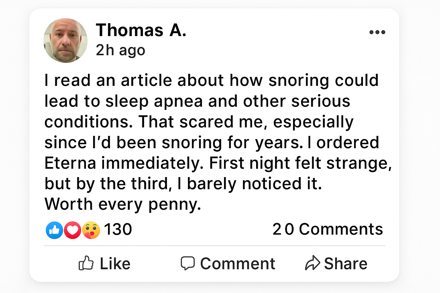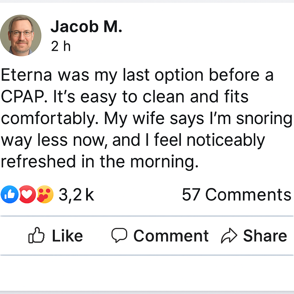 Johan D. July 2025Verified BuyerFinally sleeping in the same bed again.My husband’s snoring used to keep me up every night. We tried sprays, strips, even separate rooms. Eterna worked the very first night — I almost couldn’t believe the silence. Worth every cent.